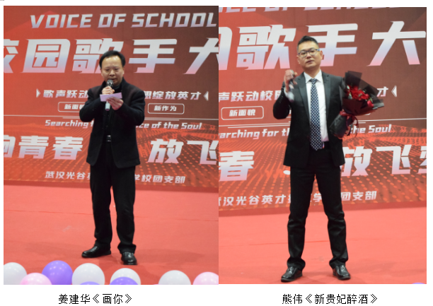 经过激烈的角逐,教师组姜建华老师和学生组钟雅淇同学斩获“校园最佳歌手”称号。教师组熊伟、潘勇刚、郑玲和熊敏红组合、谢城、李佳能5组老师与学生组张欣怡、易贝佳、张欣怡、岑紫涵、莫文卓5名同学分别获得“校园十佳歌手”称号。